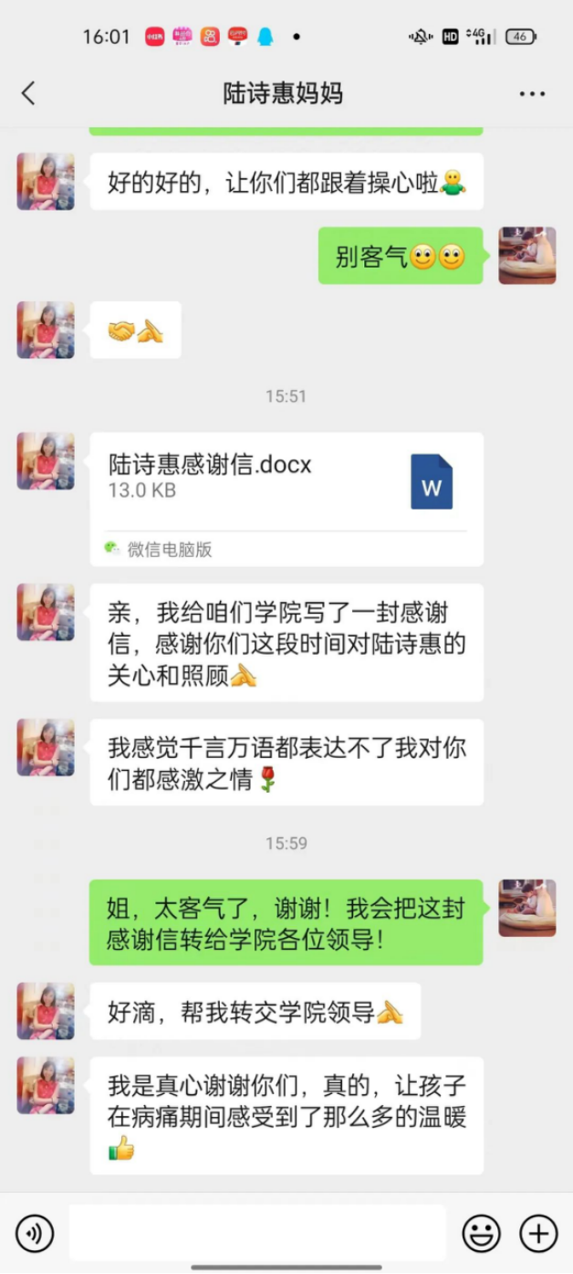 儿行千里母担忧,作为学生家长得知自己的孩子突发疾病特别是不能亲自陪伴的时候,她的焦急与担忧可想而知。在学院领导班子和辅导员悉心照料下学生的病情很快好转,家长对学院领导的感激之情无法言表,最后她以一种最质朴和最真诚的形式为学院领导写了一封感谢信,字里行间流露着对领导们无尽的感谢与感动。