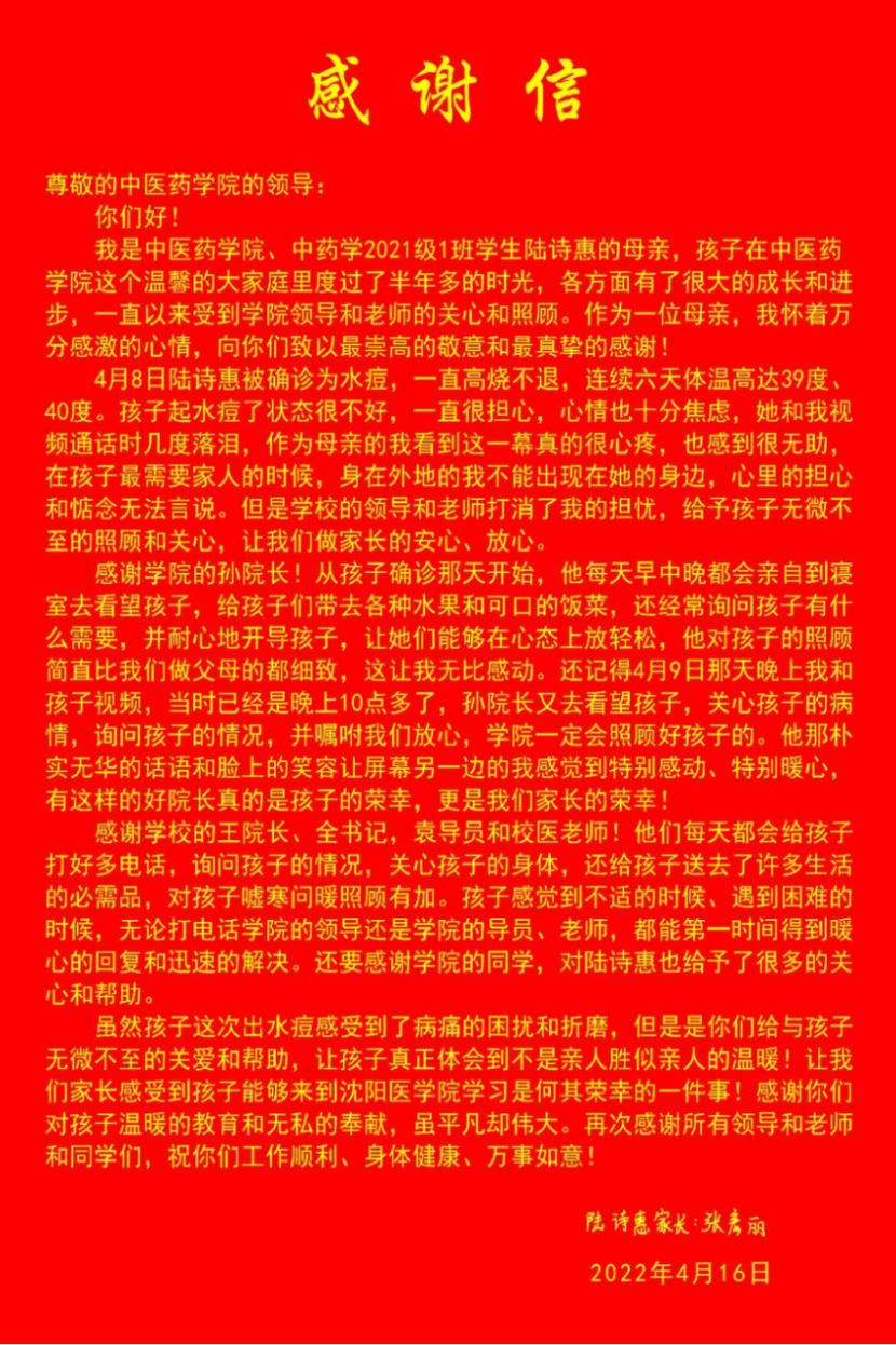 “要带着感情,带着责任,把同学们当成自己的孩子!”“要让孩子们感受到沈医的温度,要让他们感到暖心!”,中药学院全体教职工,用扎实的工作兑现着关爱与温暖每一名学生的诺言。青囊传承经典事,悠悠药香沁人心!一封家长的感谢信只是他们为学生倾情付出的一个剪影,平和的一笑之后,他们又奔赴忙碌繁杂的工作中,为学校的建设发展默默耕耘。
